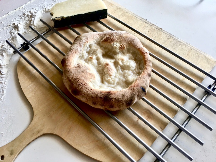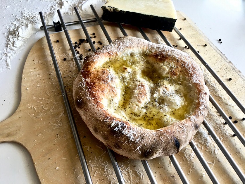 Αυτή η συνταγή έχει βασικές διαφορές από τις άλλες μιάς και τη ζύμη θα την ψήσουμε πρώτα σκέτη και αφού τη βγάλουμε από το φούρνο θα προσθέσουμε τα υπόλοιπα υλικά. Η δυσκολία σε αυτή τη διαδικασία είναι αρχικά το γεγονός πως μία ζύμη που ψήνεται χωρίς toppings έχει την τάση να φουσκώνει στο κέντρο, γεγονός που αλλοιώνει το αποτέλεσμα και σε όψη αλλά και σε γεύση. Η γεύση αλλοιώνεται κυρίως από το γεγονός πως οι μεγάλες φουσκάλες που δημιουργούνται στο κέντρο αρπάζουν και καίγονται.