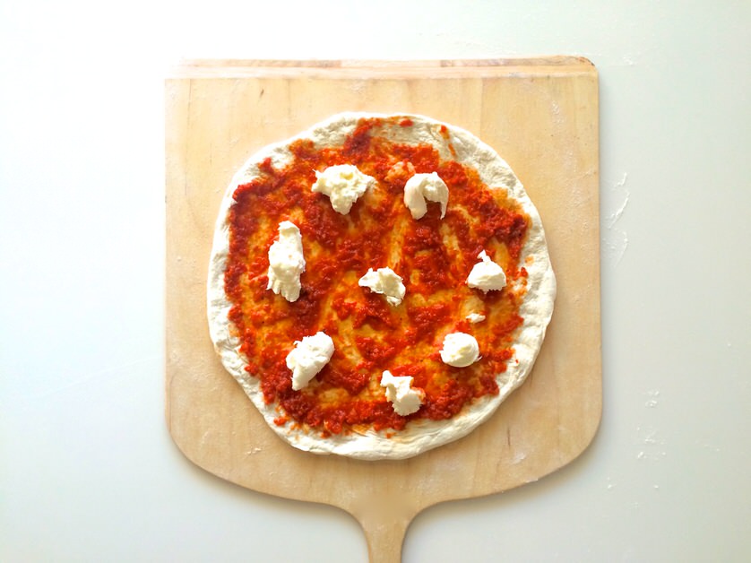 Για ένα έντονα "αρπαγμένο" old-school αποτέλεσμα, διαλέξαμε τη ζύμη rustic. Την ανοίξαμε με την τεχνική "τιμόνι" σε λεπτό πάχος για να πετύχουμε την επιθυμητή διακριτική γεύση σε συνδυασμό με ένα πληθωρικό cornicione.