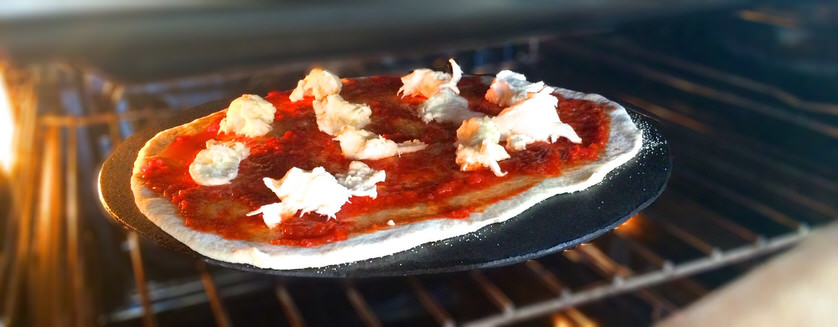 Αφού προθερμάναμε το MyPizza Slab για 45' στο maximum, η θερμοκρασία στην επιφάνειά του έφτασε τους 370°. Χρησιμοποιώντας το MyPizza Peel, ακουμπήσαμε την pizza πάνω στην πλάκα, και την αφήσαμε να ψηθεί για μόλις 4 λεπτά. Την βγάλαμε καυτή, με έντονο χρώμα, φουσκάλες, με ένα τρυφερό & αφράτο cornicione και με τη μοτσαρέλα να μένει ζουμερή και κρεμώδης. Για το τέλος αφήσαμε λίγα φύλλα φρέσκου βασιλικού, και ιδού το αποτέλεσμα: