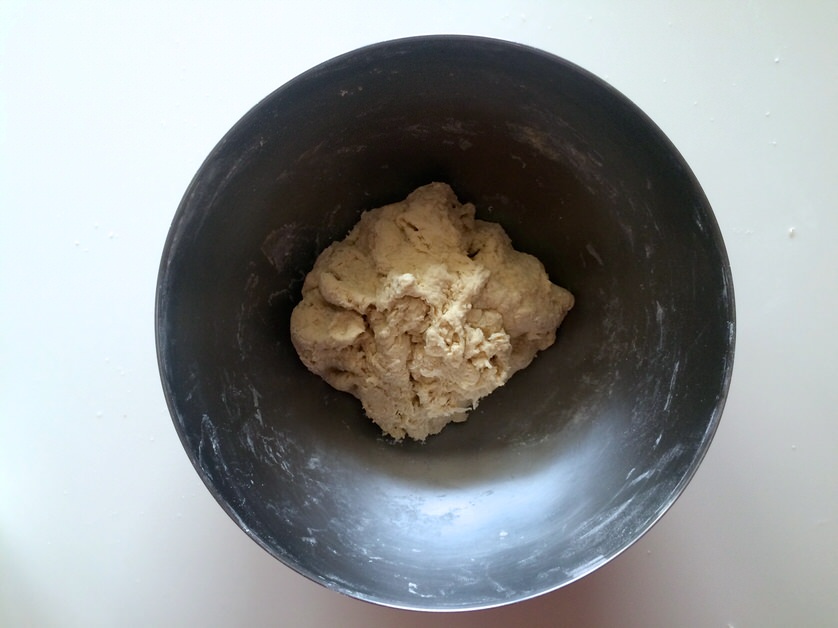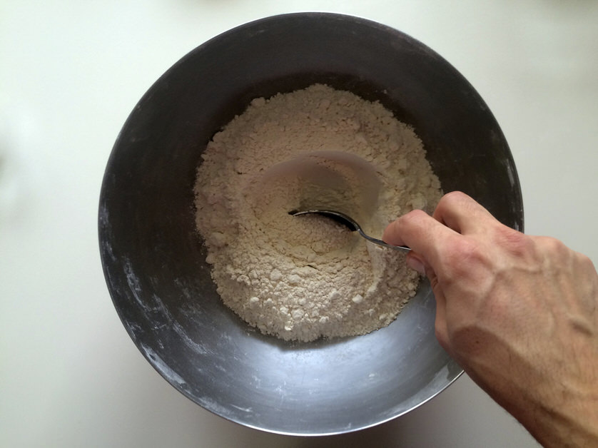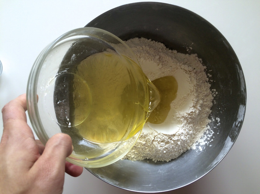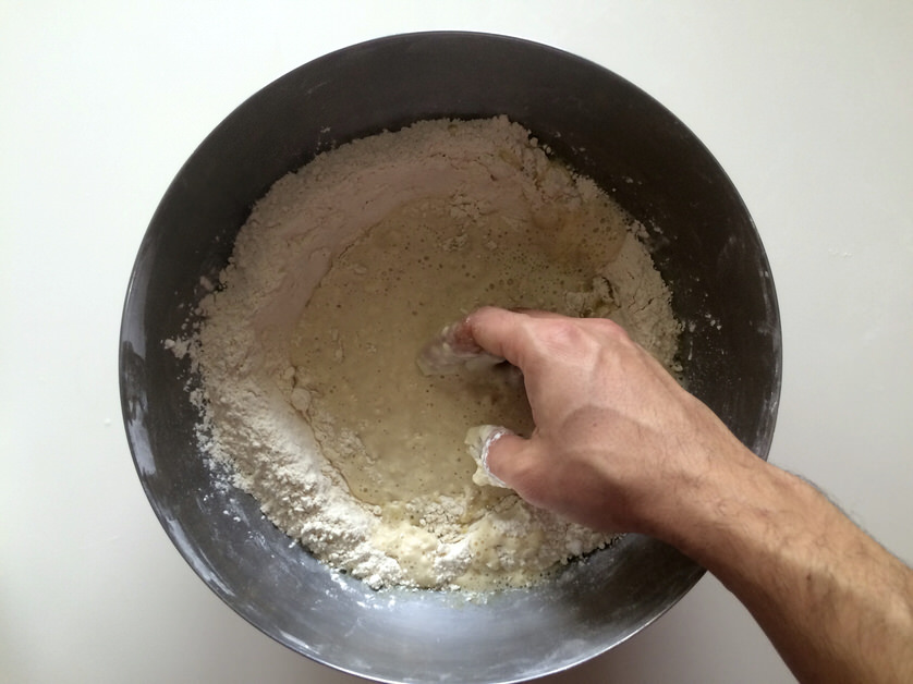 Αφου κάνουμε μια τρύπα στη μέση του μείγματος, προσθέτουμε το νερό με το μέλι και το λάδι και ανακατεύουμε μέχρι να απορροφηθούν εντελώς τα υγρά. Όσο ανακατεύουμε φροντίζουμε να μαζεύουμε το αλεύρι από τα τοιχώματα του μπολ.