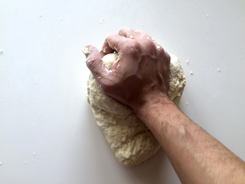 Μεταφέρουμε τη ζύμη στον πάγκο μας και ζυμώνουμε καλά για περίπου 5'-10' έως ότου να γίνει λεία και να αποκτήσει κάποια ελαστικότητα. Εάν κολλάει στα χέρια μας, τα αλευρώνουμε ελαφρώς κατά το ζύμωμα.