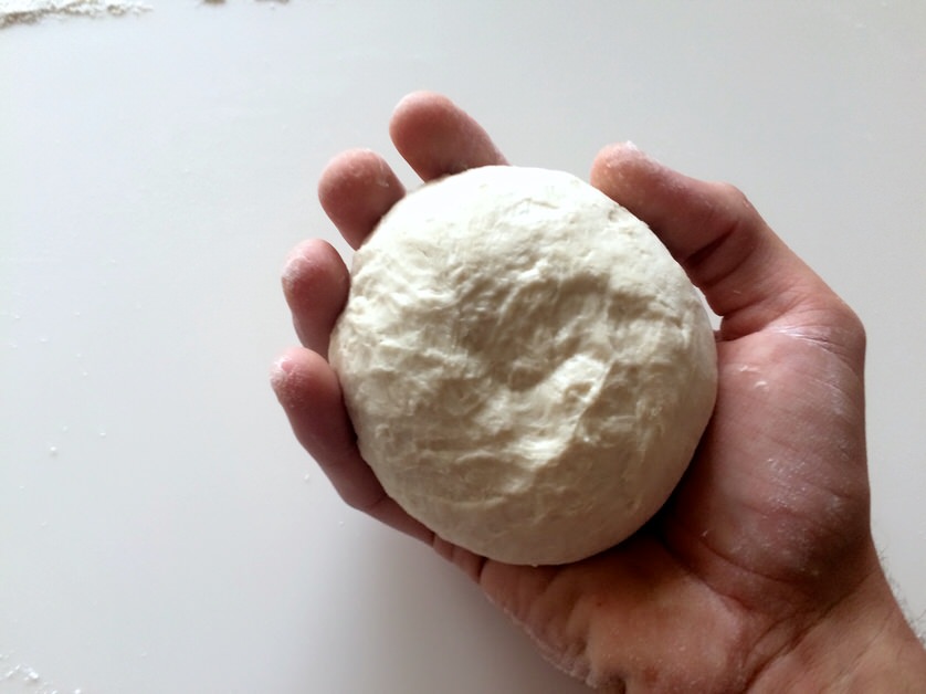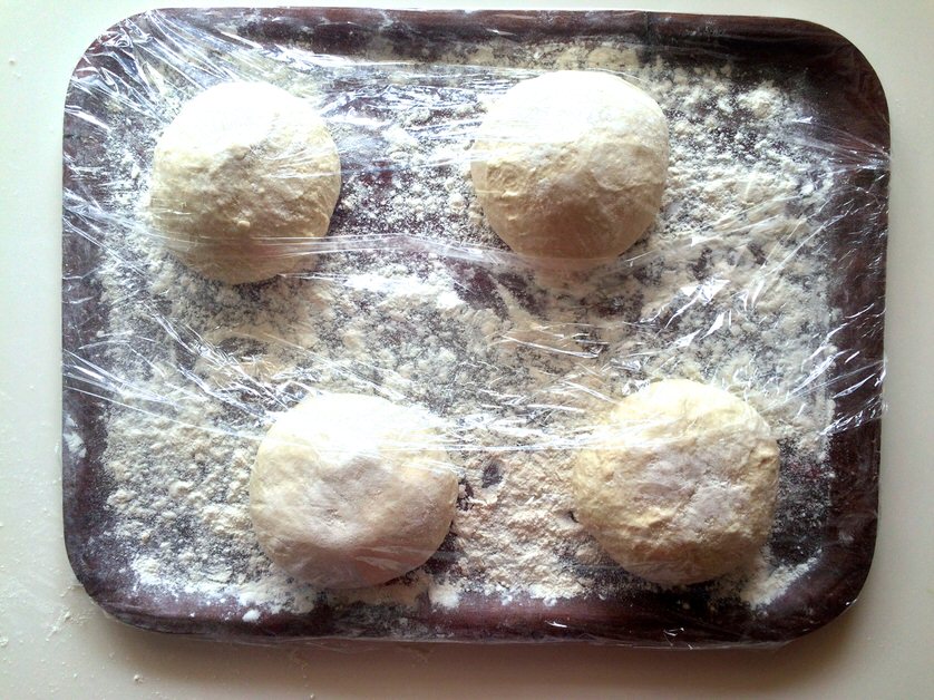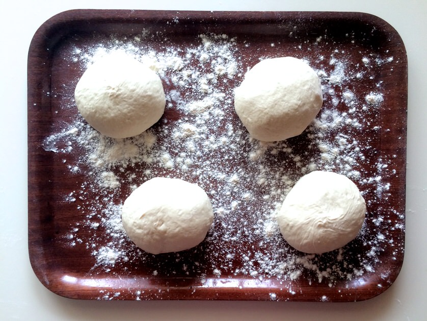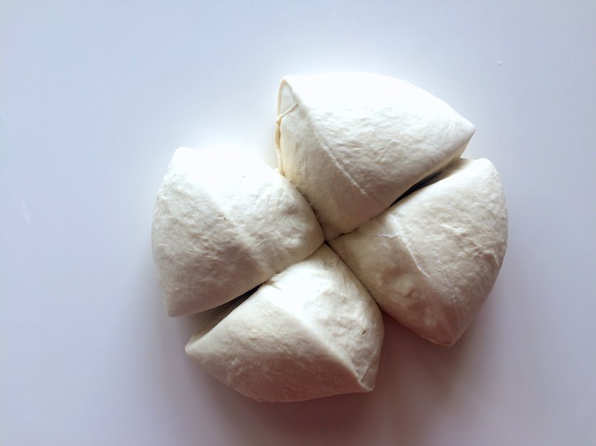Με τη γροθιά μας, πατάμε τη ζύμη να ξεφουσκώσει, τη χωρίζουμε σε 4 κομμάτια και δημιουργούμε 4 μπάλες.