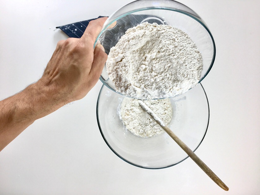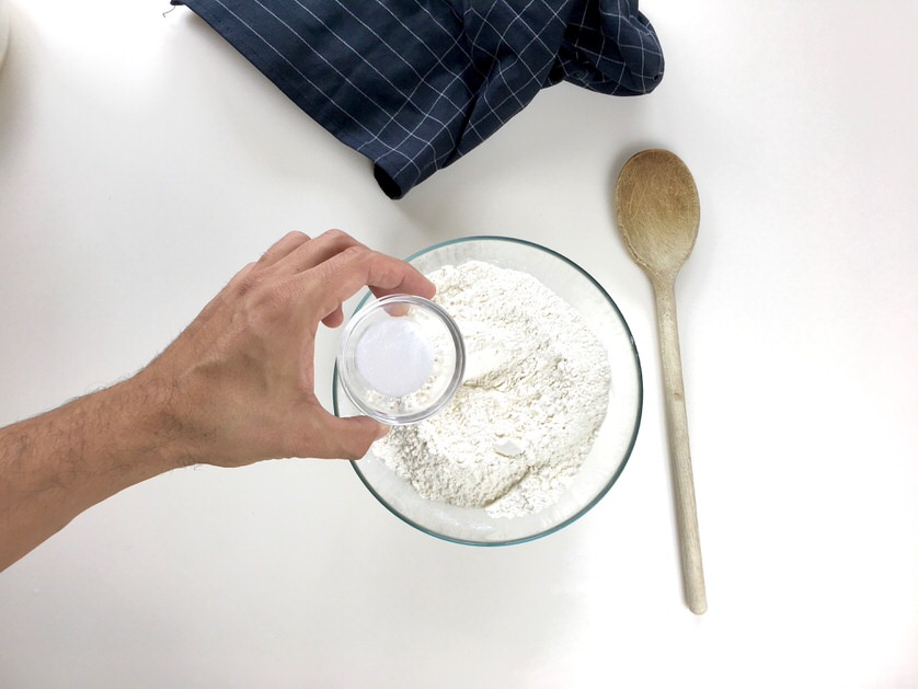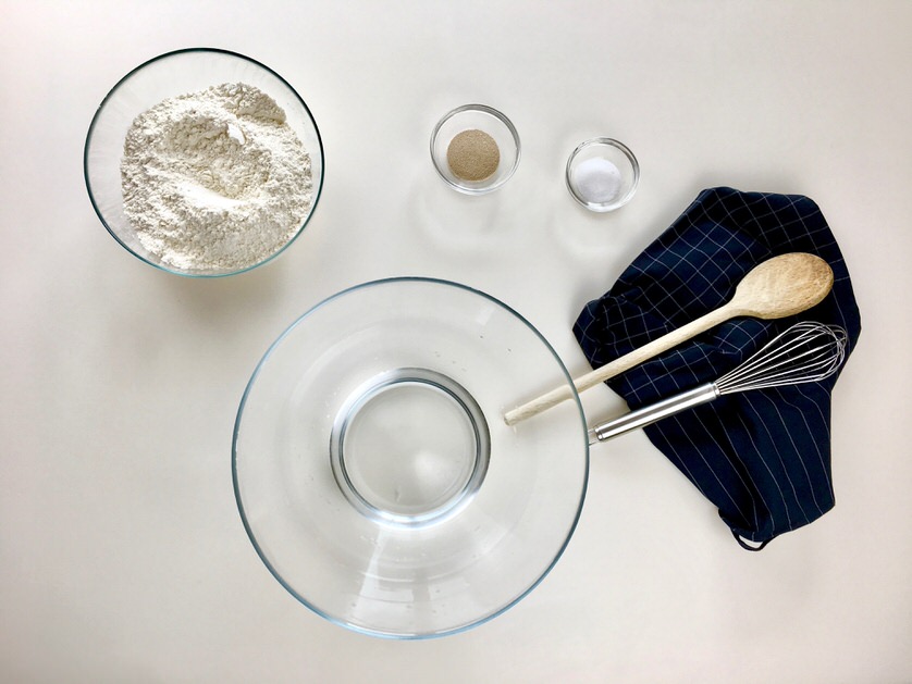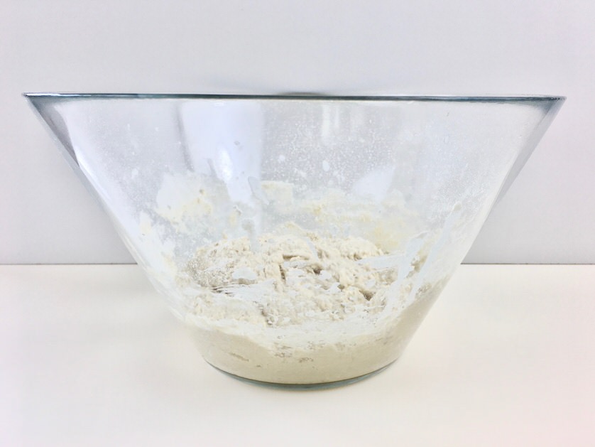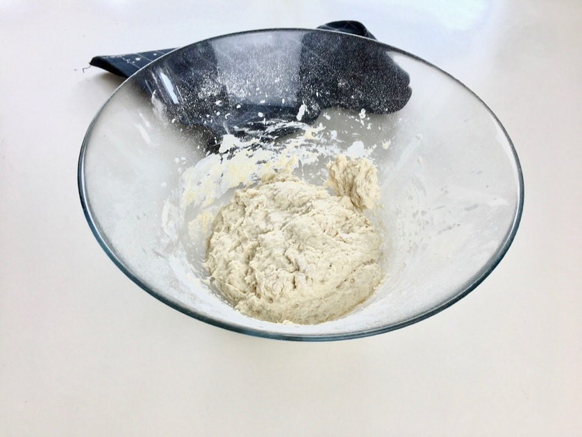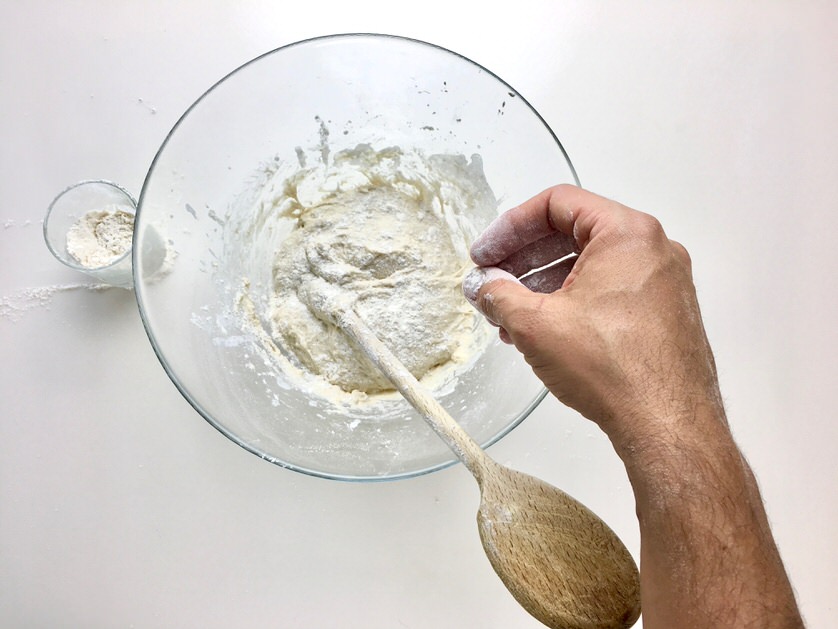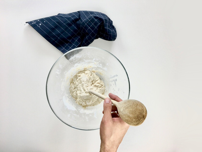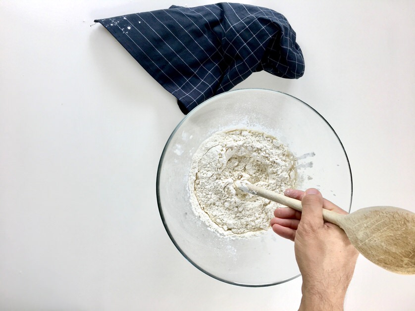 Ανακατεύουμε καλά μέχρι το αλεύρι να τραβήξει όλο το νερό και να ομοιογενοποιηθεί το μείγμα (δε θα χρειαστεί περισσότερο από ένα λεπτό). Σκεπάζουμε καλά με μεμβράνη και αφήνουμε τη ζύμη να φουσκώσει για 1 ώρα και 30 λεπτά σε ένα ζεστό σημείο.