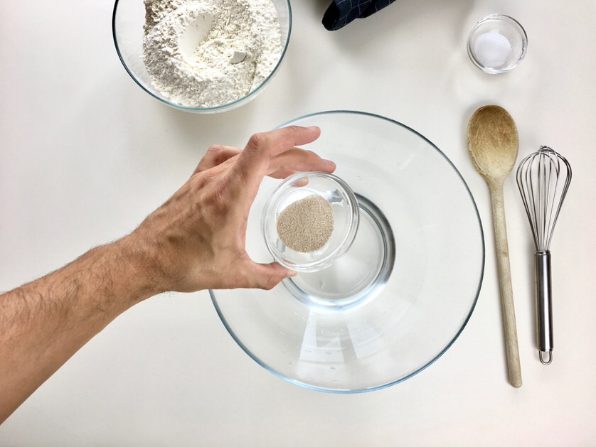Ζυγίζουμε με ακρίβεια τα υλικά μας, ρίχνουμε τη μαγιά μέσα στο νερό και ανακατεύουμε μέχρι να διαλυθεί.