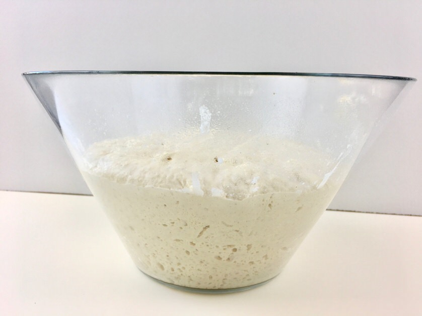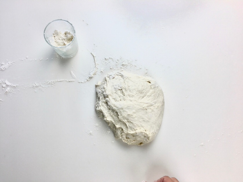 Μετά τη μιάμιση ώρα η ζύμη μας θα πρέπει να έχει φουσκώσει και να έχει διπλασιαστεί σε μέγεθος. Χρησιμοποιώντας το χερούλι της κουτάλας ανακατεύουμε τη ζύμη προκειμένου να την ξεφουσκώσουμε και αφού της ρίξουμε λίγο αλεύρι, ανακατεύουμε και πάλι για να την ξεκολλήσουμε από το μπολ και την αδειάζουμε στον αλευρωμένο πάγκο μας.