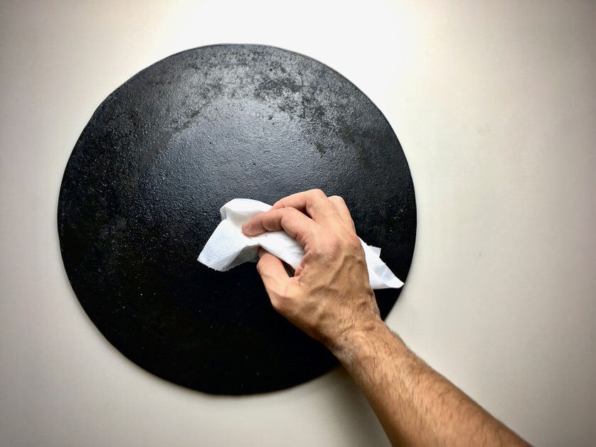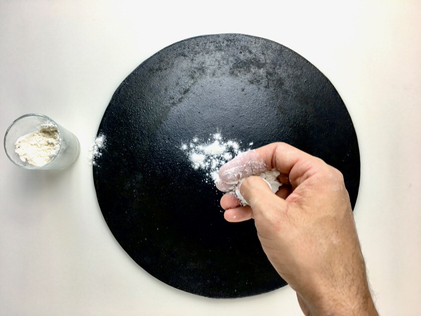 Όσο περιμένουμε, λαδώνουμε ελαφρώς το κρύο MyPizza Slab μας με λίγο χαρτί και μετά απλώνουμε λίγο αλεύρι στην επιφάνειά του.