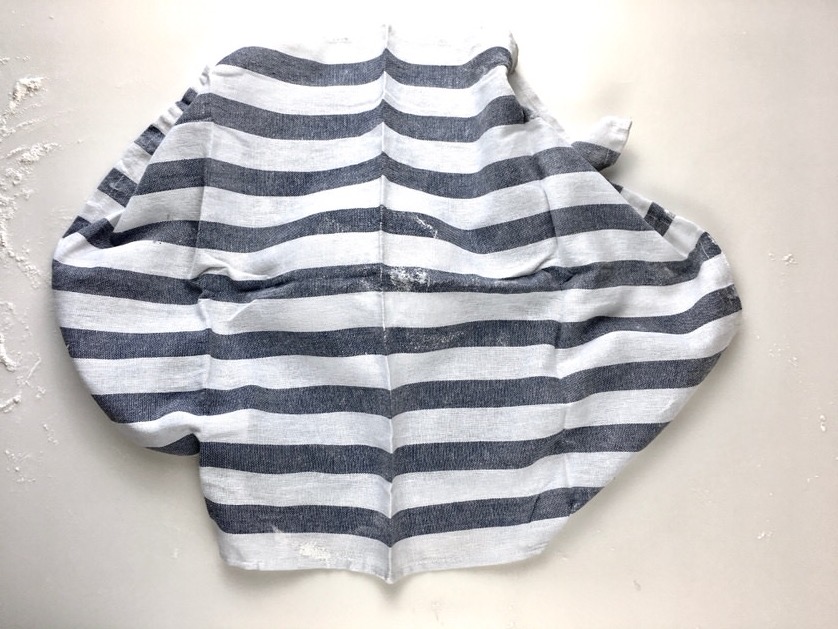 Σκεπάζουμε με μια πετσέτα το ζυμάρι και το αφήνουμε να κάνει το δεύτερο φούσκωμα για άλλα 40 λεπτά. Για να μην κολλήσει η πετσέτα πάνω στη ζύμη μπορούμε να την αλευρώσουμε ελαφρώς πριν την ακουμπίσουμε πάνω στη ζύμη.