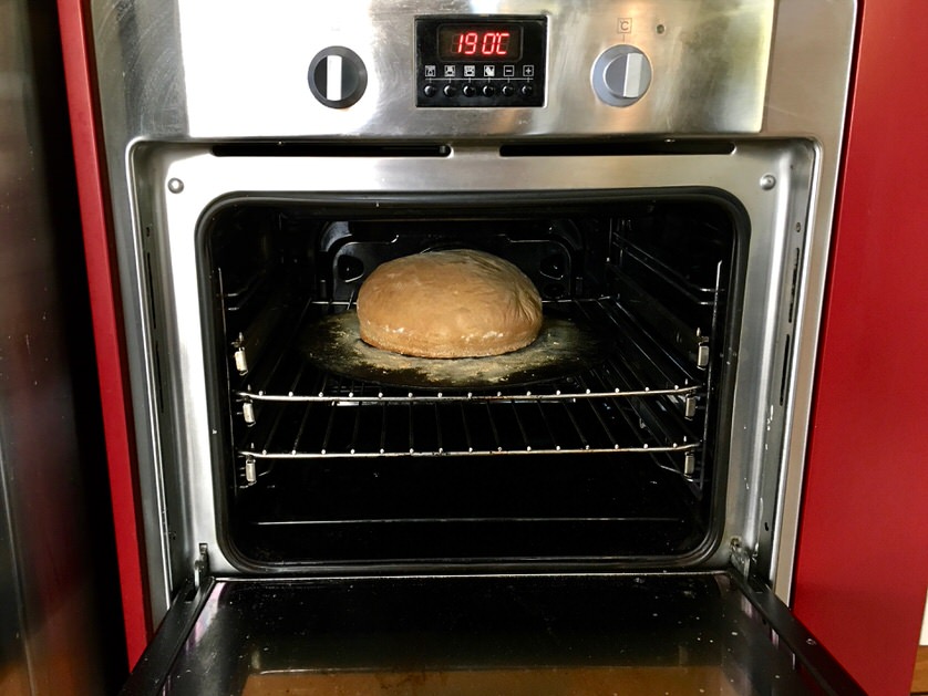 Στα μισά της αναμονής, ανάβουμε το φούρνο μας στον αέρα, στους 190 βαθμούς για να προθερμανθεί. Όταν περάσει και ο υπόλοιπος χρόνος, ξεσκεπάζουμε τη ζύμη και την βάζουμε στο φούρνο στη μεσαία σχάρα για 40'.