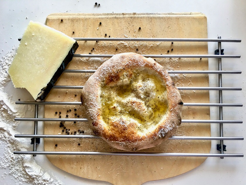 Μία τελείως διαφορετική προσέγγιση Ιταλών chef σε κλασικά πιάτα είναι η μετατροπή του πιάτου ζυμαρικών Cacio e Pepe σε πίτσα. Όπως υποδηλώνει το όνομα του, τα βασικά υλικά είναι το τυρί και το μαύρο πιπέρι, και όταν λέμε τυρί σε μία Ρωμαϊκή μακαρονάδα εννοούμε Peccornino Romano. Είτε το δείτε σαν μια διαφορετική πίτσα, είτε σαν ένα επίπεδο ψωμί με λάδι, τυράκι και πιπέρι, αξίζει να το δοκιμάσετε.
