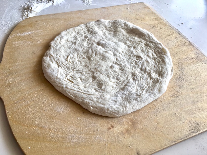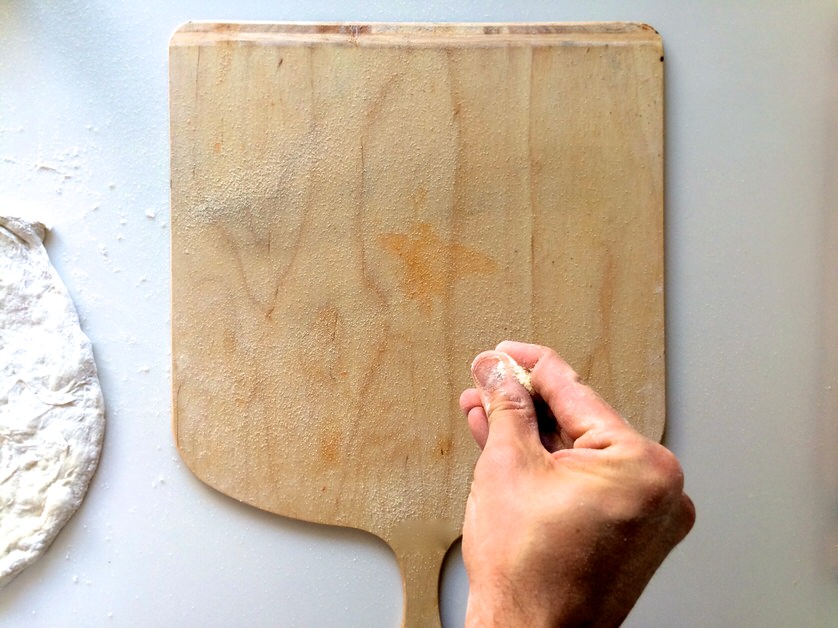 Μόλις παρέλθουν τα 45', ανοίγουμε τη ζύμη με την τεχνική της επιλογής μας στο μέγεθος που θέλουμε και την ακουμπάμε στο MyPizza Peel, αφού πρώτα πασπαλίσουμε με λίγο ψιλό σιμιγδάλι για να μην κολλήσει.
