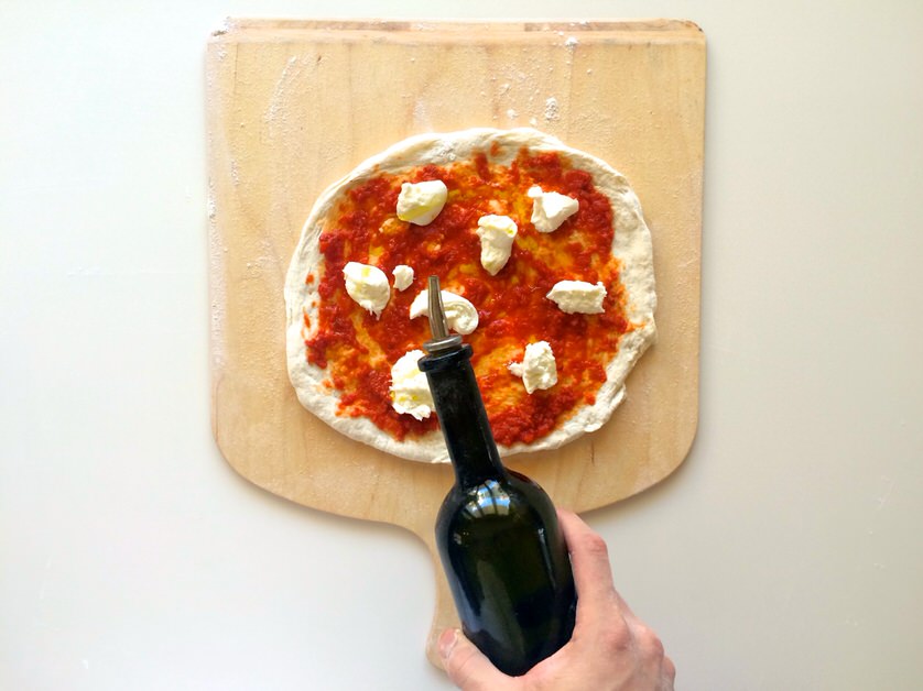 Μόλις παρέλθουν τα 45', ανοίγουμε τη ζύμη με την τεχνική της επιλογής μας στο μέγεθος που θέλουμε και την ακουμπάμε στο MyPizza Peel, αφού πρώτα πασπαλίσουμε με λίγο ψιλό σιμιγδάλι για να μην κολλήσει.