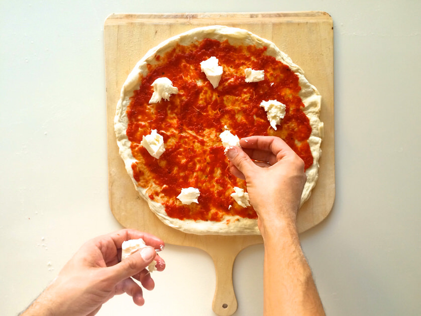 Μόλις παρέλθουν τα 45', ανοίγουμε τη ζύμη με την τεχνική της επιλογής μας στο μέγεθος που θέλουμε και την ακουμπάμε στο MyPizza Peel, αφού πρώτα πασπαλίσουμε με λίγο ψιλό σιμιγδάλι για να μην κολλήσει.