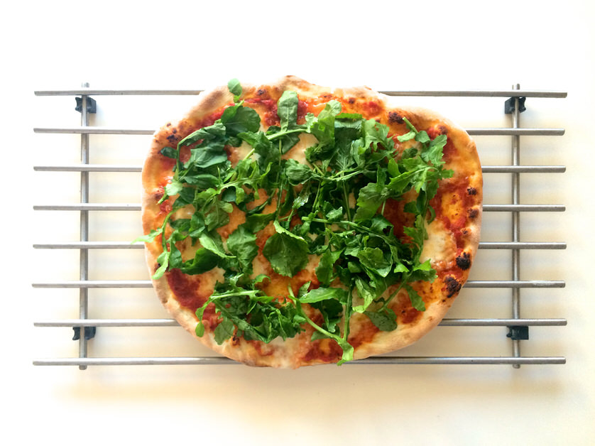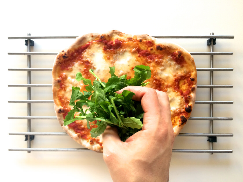 Βγάζουμε την πίτσα από το φούρνο, την τοποθετούμε σε μία σχάρα και προσθέτουμε τα φύλλα της ρόκας και το προσούτο.