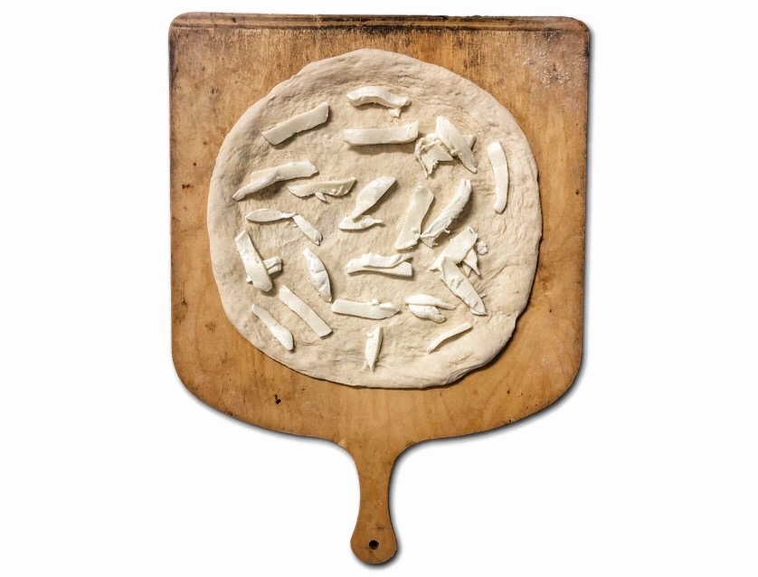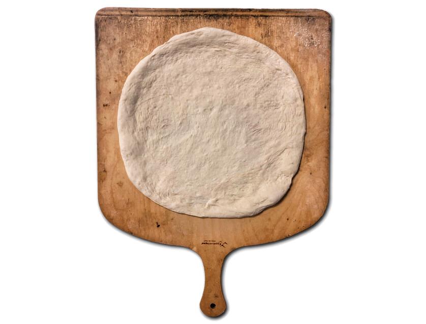 Μόλις παρέλθουν τα 45', ανοίγουμε τη ζύμη με την τεχνική της επιλογής μας στο μέγεθος που θέλουμε και την ακουμπάμε στο MyPizza Peel, αφού πρώτα πασπαλίσουμε με λίγο ψιλό σιμιγδάλι για να μην κολλήσει.