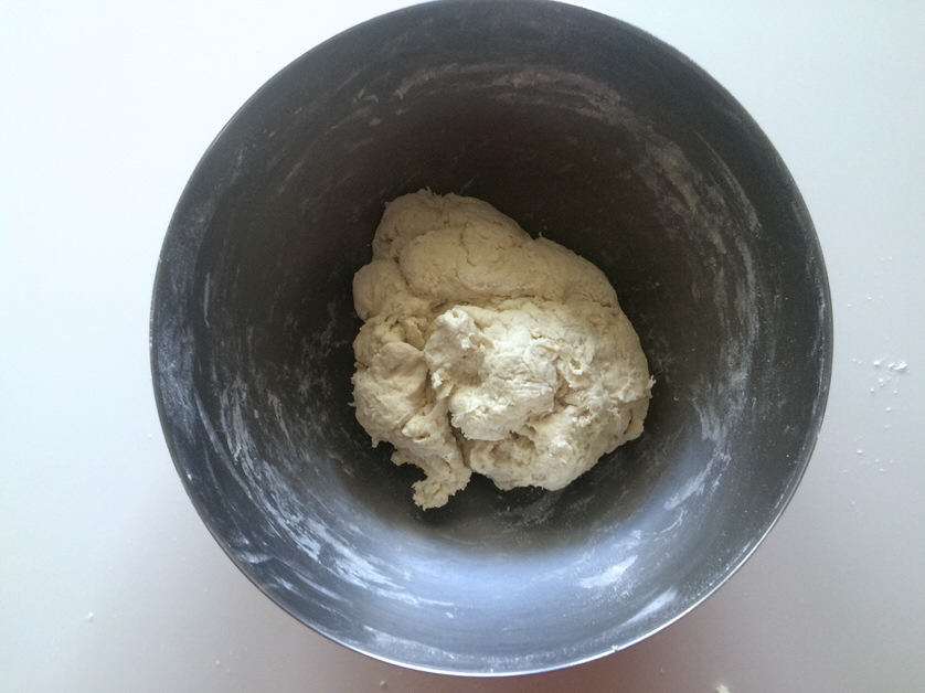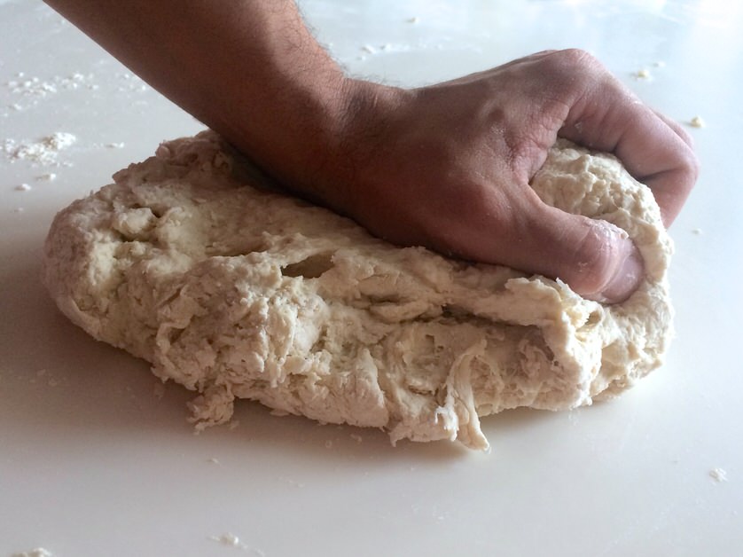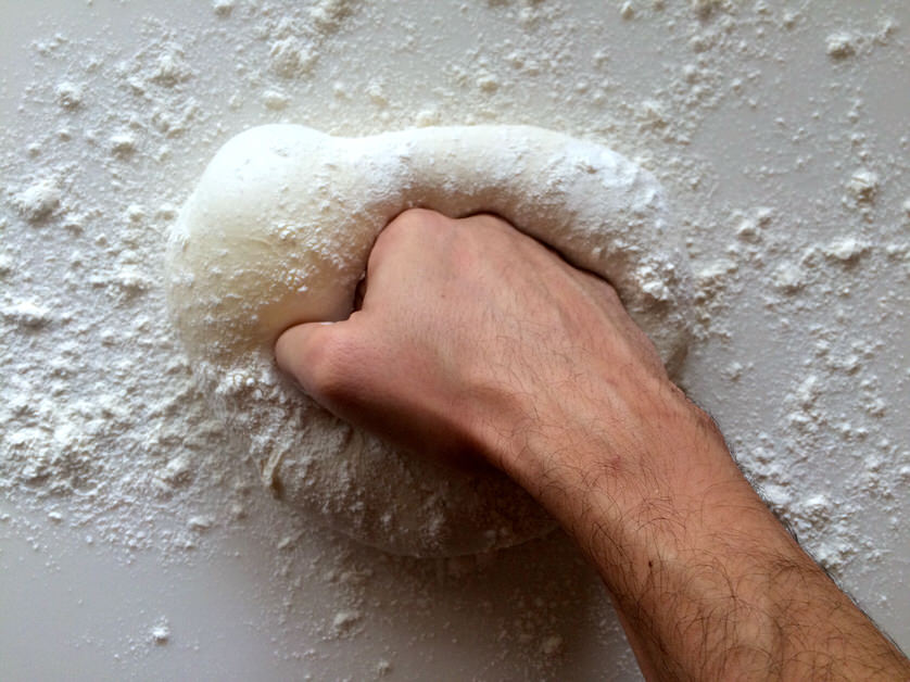 Όσο ανακατεύουμε φροντίζουμε να μαζεύουμε το αλεύρι από τα τοιχώματα του μπολ. Μεταφέρουμε τη ζύμη στον πάγκο μας και ζυμώνουμε καλά για περίπου 5'-10' έως ότου να γίνει λεία και αποκτήσει κάποια ελαστικότητα. Εάν κολλάει στα χέρια μας, τα λαδώνουμεελαφρώς κατά το ζύμωμα.