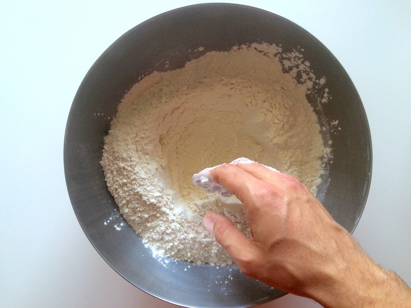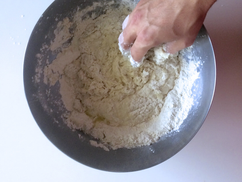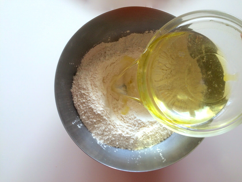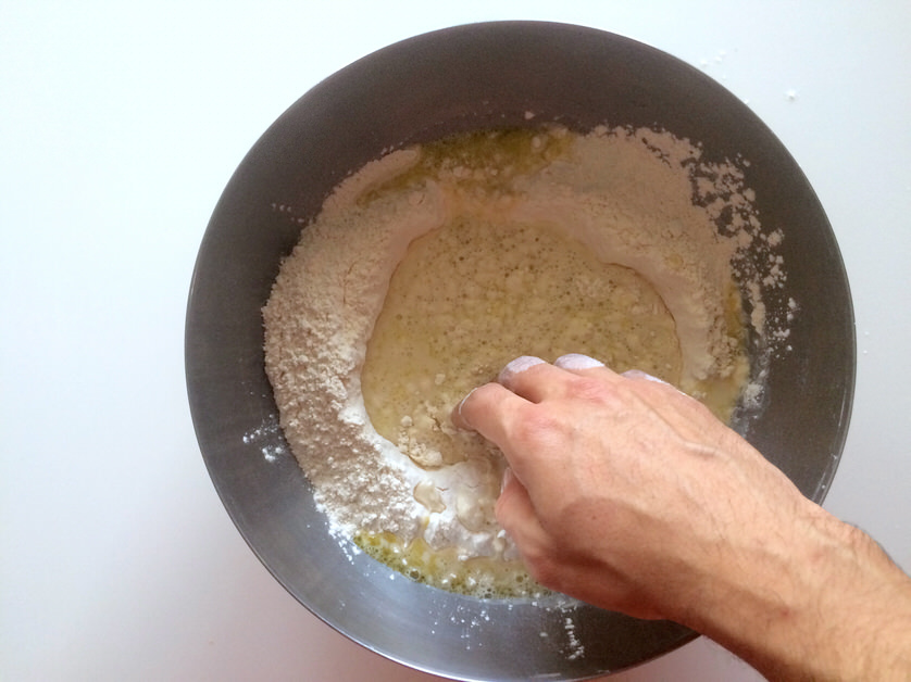 Σε διαφορετικό σκεύος, αναμειγνύουμε το λάδι με το κρύο νερό και κάνουμε μια τρύπα στη μέση του μείγματος με το αλεύρι.