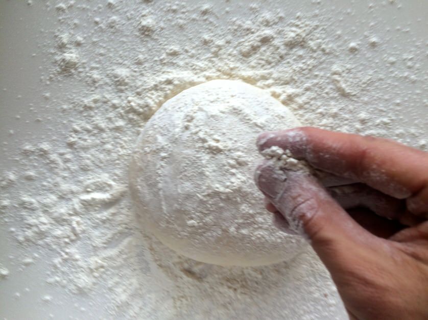 Με μεγάλη προσοχή και με τη βοήθεια μίας εύκαμπτης σπάτουλας ζύμης, ξεκολλάμε τη ζύμη από το δίσκο και χωρίς να την σκάσουμε αρχίζουμε να την ανοίγουμε σε πολύ καλά αλευρωμένη επιφάνεια εργασίας. Εάν οι ζύμες μας βρίσκονται στο κουτί ζύμης , αλευρώνουμε καλά όλες τις πλευρές τις μπάλας μας και με ένα κόφτη ζύμης ξεχωρίζουμε τις ζύμες μας και τις σηκώνουμε προσεκτικά φτυαρίζοντας τες από κάτω με τη σπάτουλας ζύμης μας.